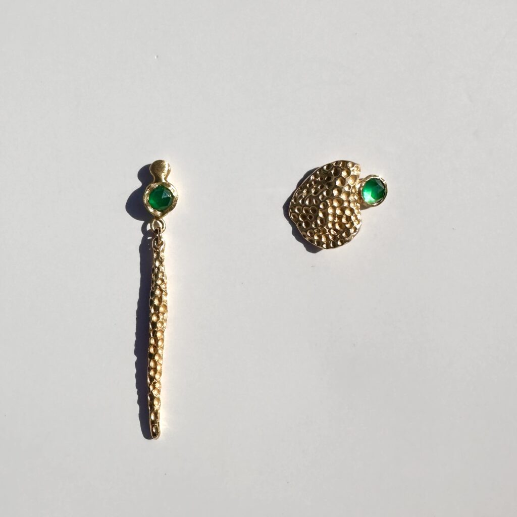 Asymetryczne kolczyki ze srebra pozłacanego o rzeźbiarskiej formie. Jeden z nich ma wydłużony kształt inspirowany kwiatostanem anturium, zawieszony na elemencie z naturalnym kamieniem – agatem, w formie fasetowanej rozety; drugi — subtelny, przylegający do płatka ucha. Oba zdobi nieregularna, perforowana faktura, która nadaje im lekkości i organicznego charakteru