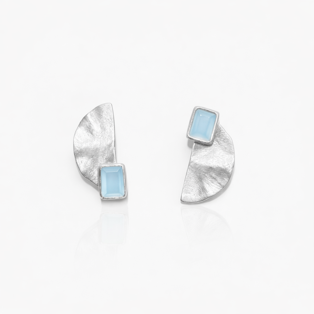 Asymetryczne kolczyki w kształcie półkola o nieregularnej fakturze. Wykonane ze srebra 925 pozłacanego 24k złotem z oprawionymi agatami niebieskimi w kształcie oktagonu.