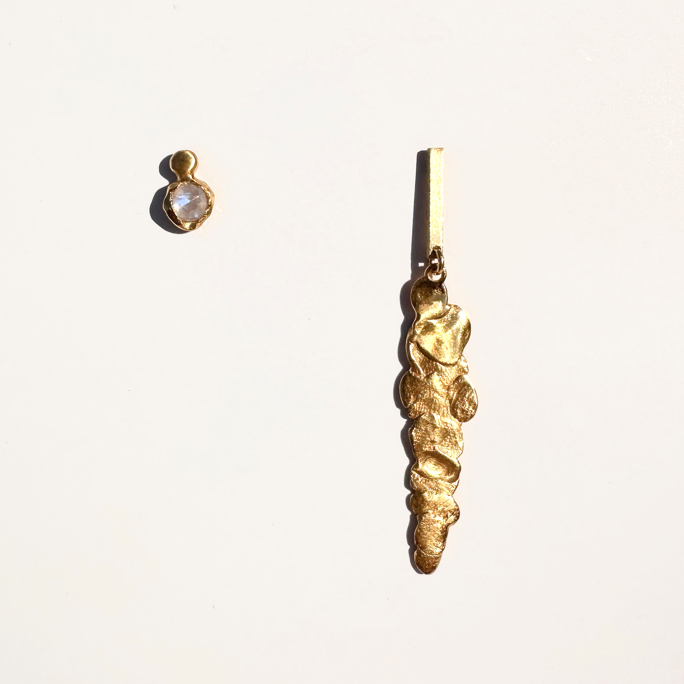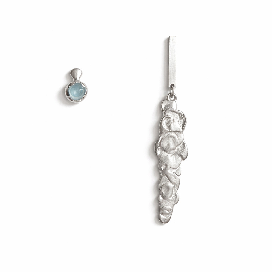 Asymetryczne, awagardowe kolczyki z których jeden jest długi o nieregularnej, organicznej fakturze, a drugi dla kontastu jest drobnym akcentem, składającym się