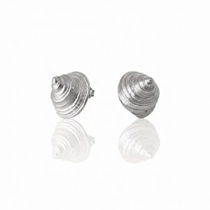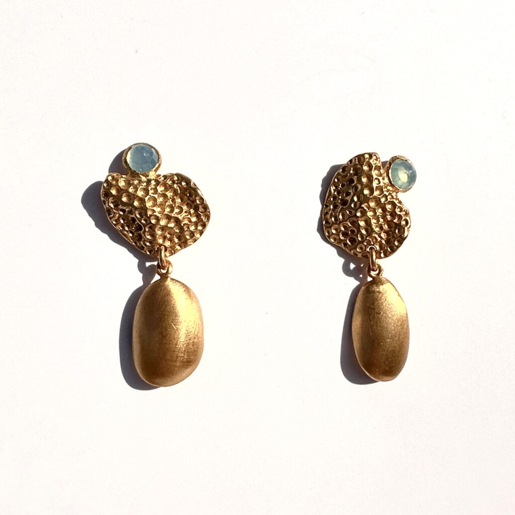 Ruchome, okazałe kolczyki ze srebra pozłacanego o rzeźbiarskiej formie z asymetrycznie osadzonymi naturalnymi kamieniami – agatami błekitnymi w formie fasetowanej rozety. Kolczyki zdobi nieregularna, perforowana faktura, która nadaje im lekkości i organicznego charakteru. Agaty pięknie korespondują ze światłem, subtelnie lśnią, tworząc efekt głębi i miękkiego blasku.
