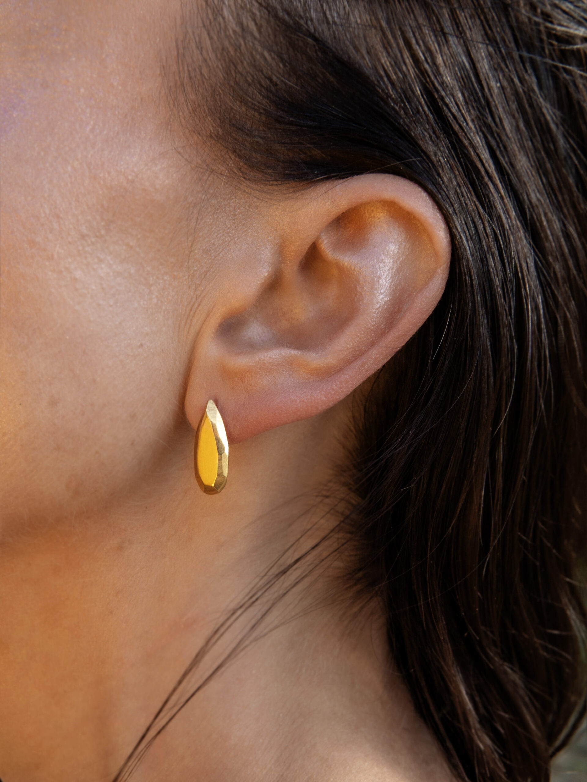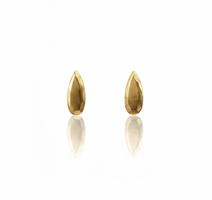 Kolczyki w kształcie bryłek o fasetowanej powierzchni. Ich kształt nawiązuje do oszlifowanego kamienia szlachetnego którego geometryczne ścięcia subtelnie odbijają światło. Wykonane ze srebra 925. Pozłacane 24k złotem.