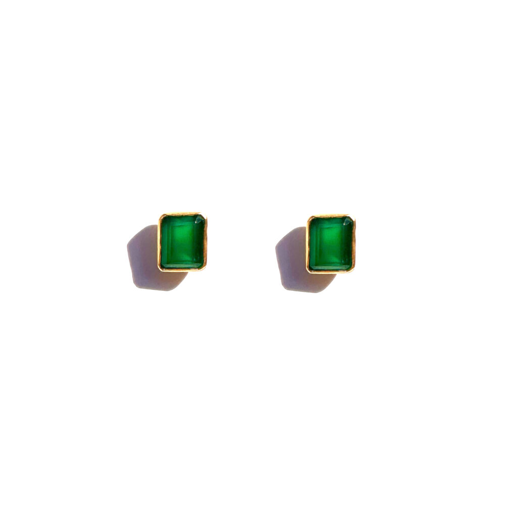 Bazę stanowią naturalne kamienie – agat zielony, o głebokiej barwie butelkowej zieleni i w kształcie oktagonu 8×6 mm, oprawione w srebro.