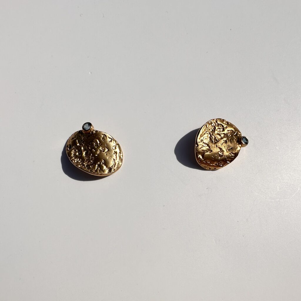 Kolczyki w kształcie nieregularnych płatków o fakturze inspirowanej strukturą koralowców. Wykonane ze srebra próby 925 pozłacanego 24k złotem, zdobione okrągłym naturalnym kamieniem topazem london blue o średnicy 2,5 mm. Ich organiczna forma i głęboki, morski odcień kamienia przywodzą na myśl światło przenikające wodę i podwodne krajobrazy — subtelne, a zarazem pełne wyrafinowanego blasku.