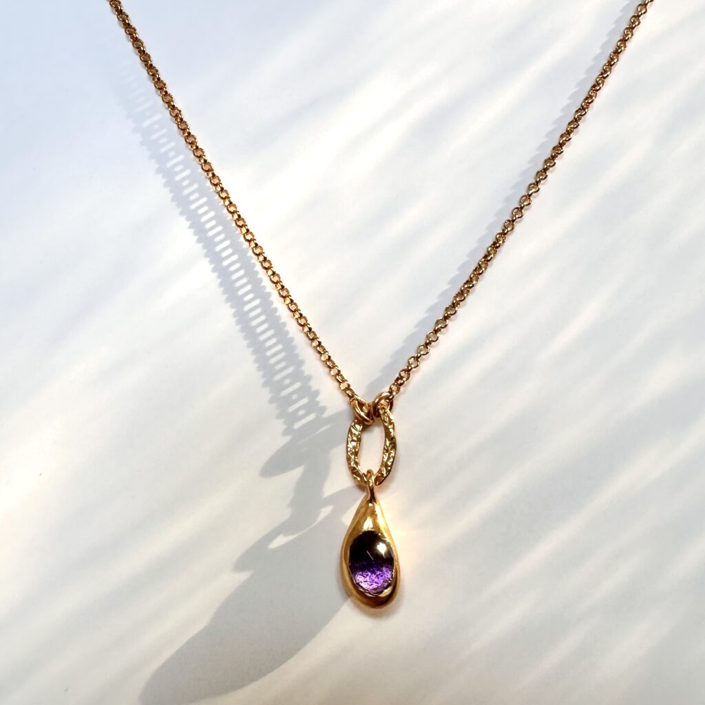 Ciekawy naszyjnik wykonany ze srebra 925. Zawieszony na srebrnym łańcuszku z zawieszką w kształcie kropli z osadzonym kamieniem naturalnym – ametystem o średnicy 8×6 mm. Długość naszyjnika 45 cm, z możliwością przedłużenia do 50 cm.