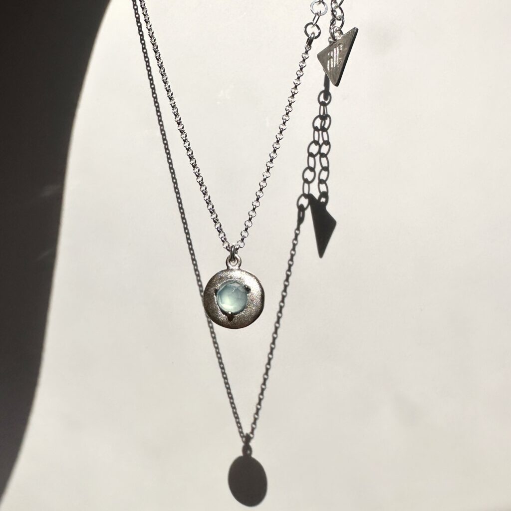 Ciekawy naszyjnik wykonany ze srebra 925 z okrągłą zawieszką z oprawionym agatem aqua o średnicy 6 mm. Długość naszyjnika 45 cm, z możliwością przedłużenia do 50 cm.