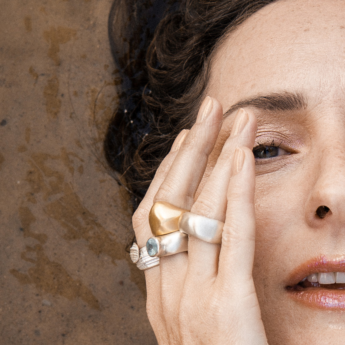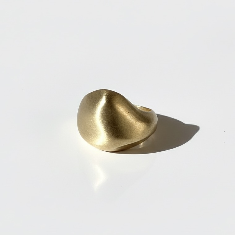 Okazały pierścionek ze srebra 925 o miękkich, opływowych kształtach. Pozłacany 24k złotem, grubą warstwą 2 mikrony. Jego organiczna forma przywodzi na myśl falujące linie wody i naturalny rytm krajobrazu — pełen harmonii, światła i subtelnego ruchu.